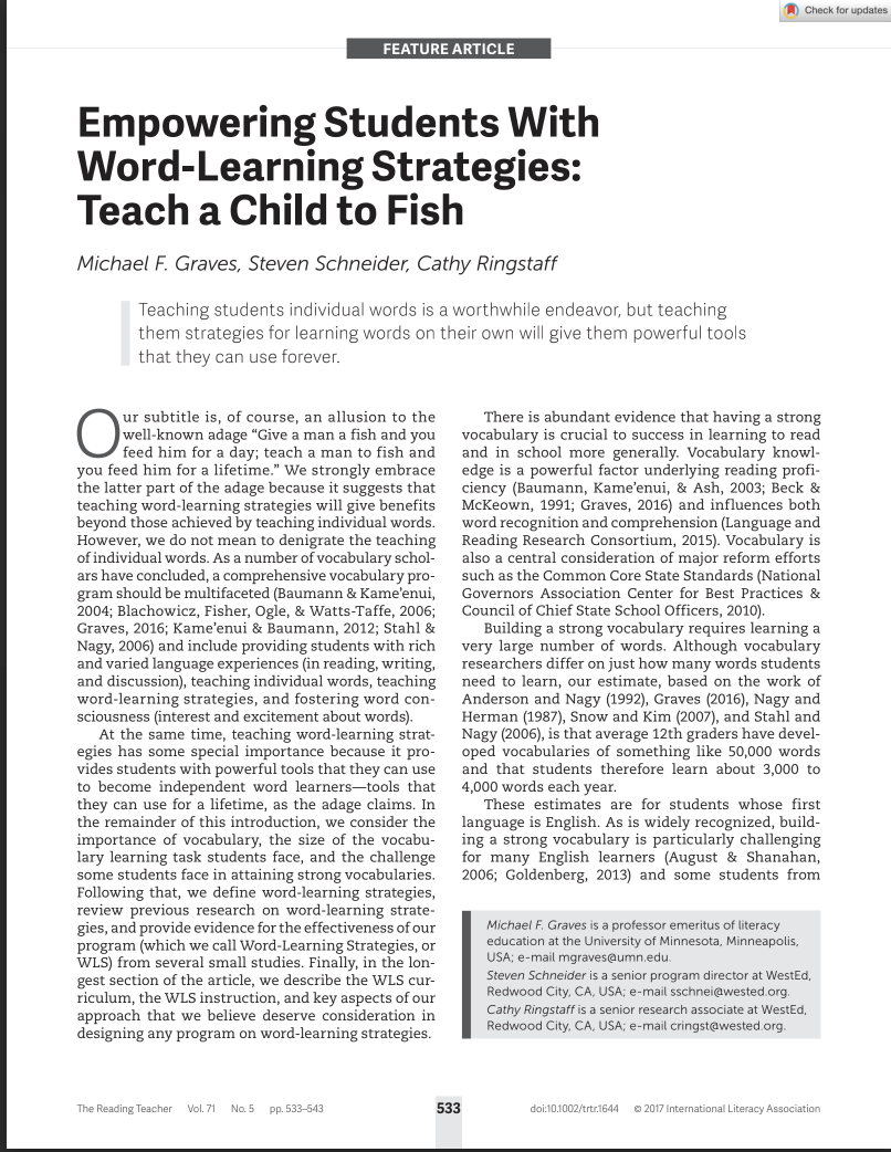 Empowering Students with Word Learning Strategies: Teach a Child to Fish by MIchael F. Graves et al.