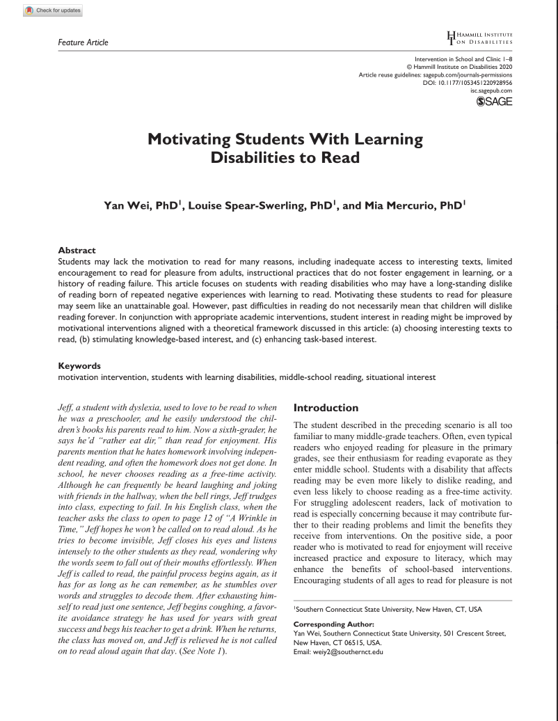Motivating Students with Learning Disabilities to Read by Yan Wei, Louise Spear-Swerling, and Mia Mercurio