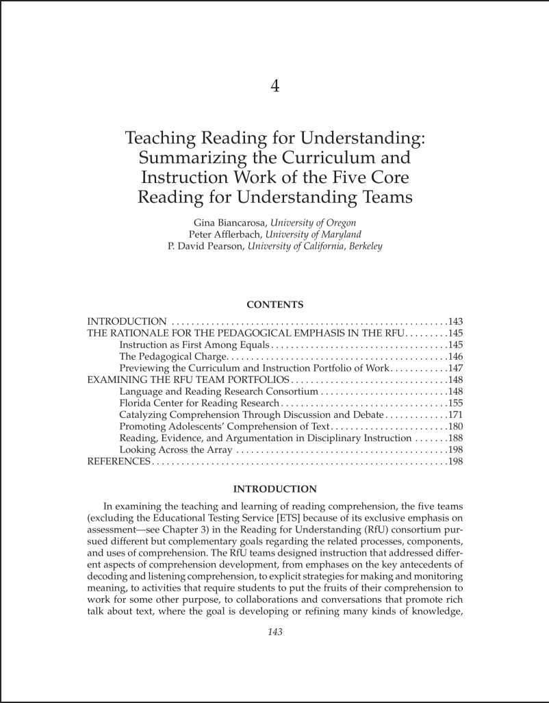 In examining the teaching and learning of reading comprehension, the five teams in the Reading for Understanding (RfU) consortium pursued different but complementary goals regarding the related processes, components, and uses of comprehension.